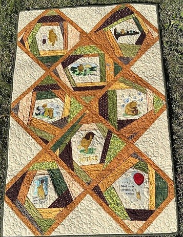 Beth’s sample features a Winnie the Pooh design collection, but you can choose any licensed embroidery set that speaks to you — from florals and animals to seasonal motifs or storybook characters. You’ll learn how to stitch, piece, and assemble your embroidered blocks on point for a lively, creative layout full of charm and personality.