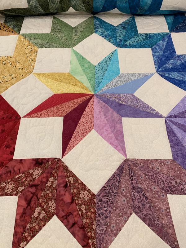 This quilt pattern is an original design. The quilter showcases her expert mastery of color in this beautiful quilt! Hand-quilted by a Mennonite friend, Lancaster County, PA.