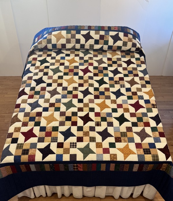 The Nine Patch block is foundational to many quilt designs. It’s a simple little block that performs effortlessly in so many applications, but shines beautifully every time! Admire the straightforward pattern and this quilter’s excellent choices in color value and placement. The Nine Patch Star features star blocks as a variation of the Nine Patch. Hand-quilted by an Amish friend, Lancaster County, PA.