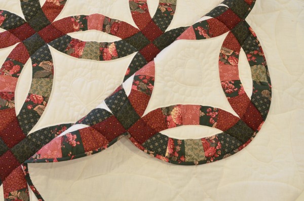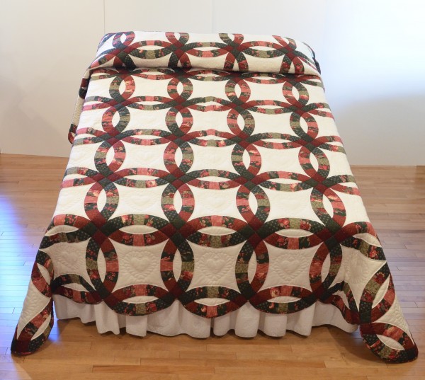 This traditional pattern is an elegant addition to any bedroom and is often gifted as a classic wedding or anniversary gift. The intertwining circles created from curved pieces of fabric require a skilled seamstress, and the intricate hand-quilting exemplifies outstanding workmanship.