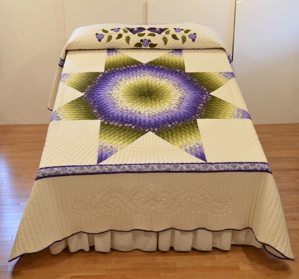 The Lone Star is a classic pattern that appeals to many buyers! It requires careful piecing for the diamonds to align perfectly and the center of the quilt to lay flat.