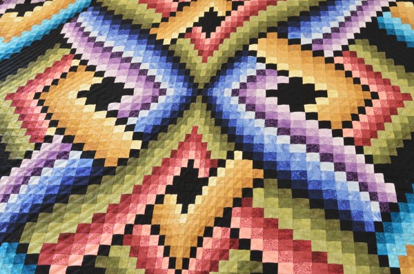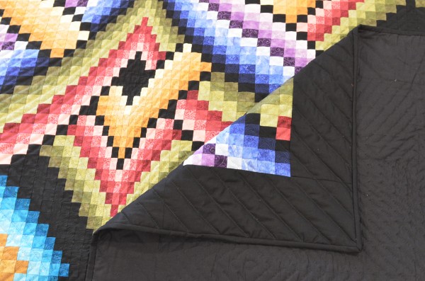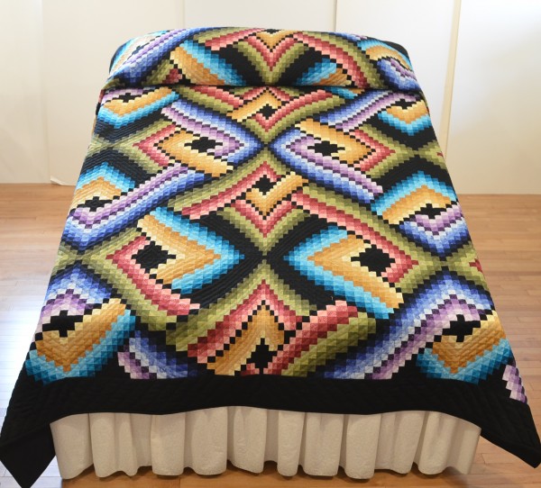 Wow! With so many twists and turns, the quilter of the Mystic Night needs to possess great organizational skills and an amazing eye for color placement. The design, a variation of the Bargello, is stunning in solid-colored fabrics. Each block has quilting, the work of a seasoned quilter.