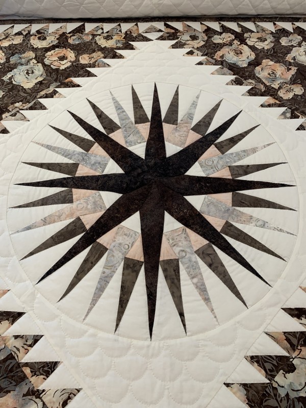 The bed skirt portion features Compass points and is a stunning accent to the overall design. The workmanship required to make this quilt is not for a beginner!