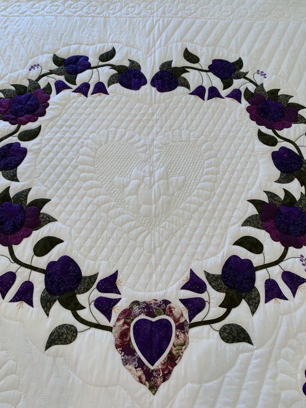 A beautiful romantic quilt design, the Heart of Roses quilt features hand-appliqued roses, leaves and berries in a pleasing heart-shaped arrangement.