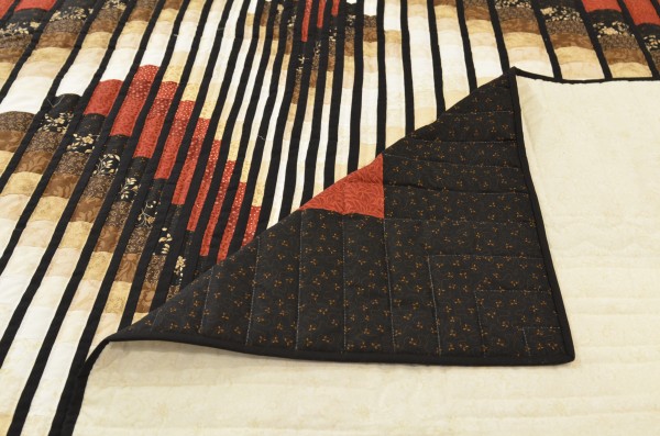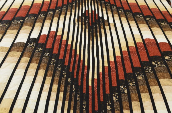 Waves of color seem to skip around the quilt in a random fashion, and thin stripes of color break the shifting waves.