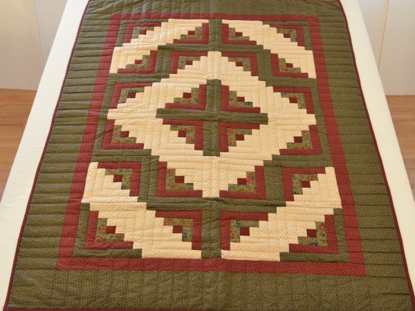 Traditionally, the center of the “cabin” features a red block for the fire or hearth, the gathering place of any home. Each "log" is accented with hand-quilting giving the quilt added loft and beauty.