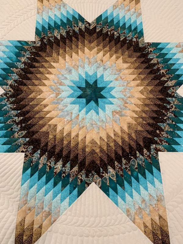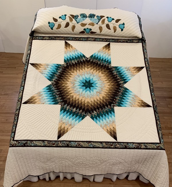 The Lone Star is a classic pattern that appeals to many buyers! It requires careful piecing for the diamonds to align perfectly and the center of the quilt to lay flat.
