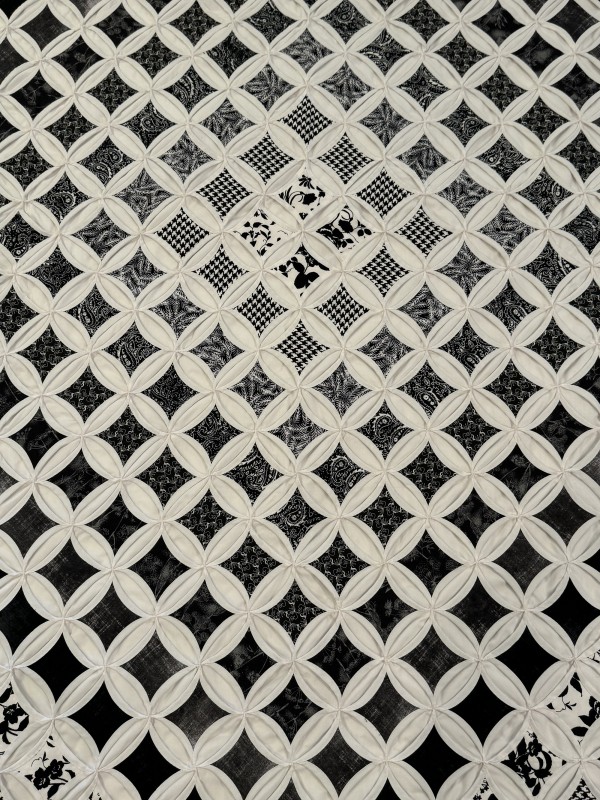 The Cathedral Window pattern is a very old one that’s quite labor-intensive. Each colored panel in this quilt has been hand-sewn in place and carefully arranged in a precise pattern. While there's no batting filler between the layers, the 30-plus yards of muslin fabric add substantial weight and body to the quilt. Notice the saw-tooth edge around all four sides of the quilt. Please note, this quilt fits nicely on both a King- and Queen-size bed. Hand-sewn by a friend, Lancaster County, PA.