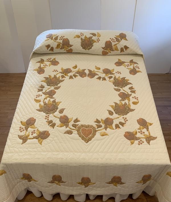 A beautiful romantic quilt design, the Heart of Roses quilt features hand-appliqued roses, leaves and berries in a pleasing heart-shaped arrangement. The quilting in this design is always extensive, especially in the center of the heart. Hand-quilted by a friend, Lancaster County, PA.