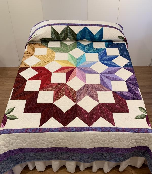 This quilt pattern is an original design. The quilter showcases her expert mastery of color in this beautiful quilt! Hand-quilted by a Mennonite friend, Lancaster County, PA.