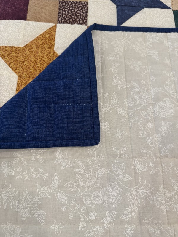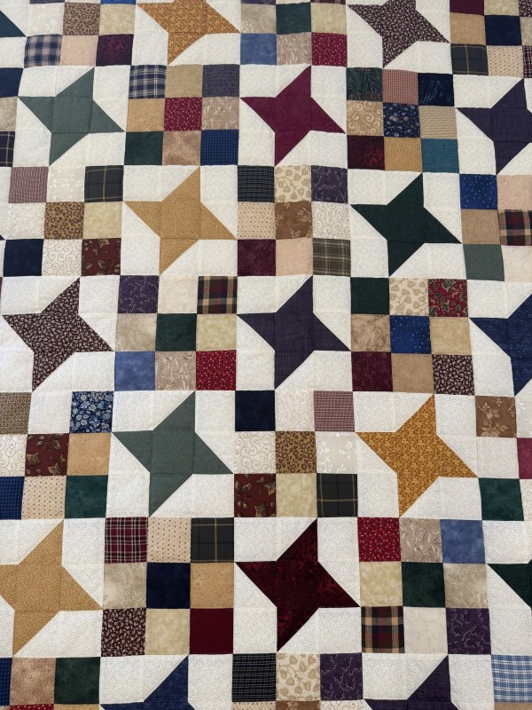 The Nine Patch block is foundational to many quilt designs. It’s a simple little block that performs effortlessly in so many applications, but shines beautifully every time! Admire the straightforward pattern and this quilter’s excellent choices in color value and placement. The Nine Patch Star features star blocks as a variation of the Nine Patch. Hand-quilted by an Amish friend, Lancaster County, PA.