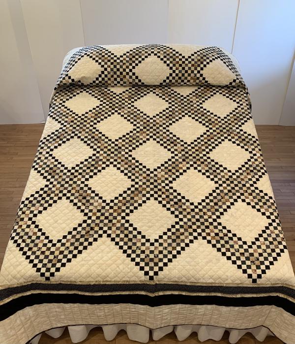 A combination of two beloved patterns, thousands of small postage stamp-sized pieces all work together in this Irish Chain design known for its simplicity and airy quality! The quilt-maker's artful placement of color creates a visually pleasing design. Precise piecing and intricate hand-quilting make this quilt a stunning heirloom. Hand-quilted by a Mennonite friend, Lancaster County, PA.