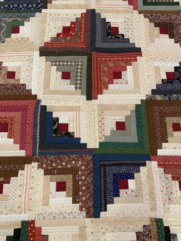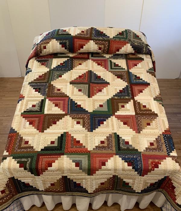 Traditionally, the center of the “cabin” features a red block for the fire or hearth, the gathering place of any home. Each "log" is accented with hand-quilting giving the quilt added loft and beauty.