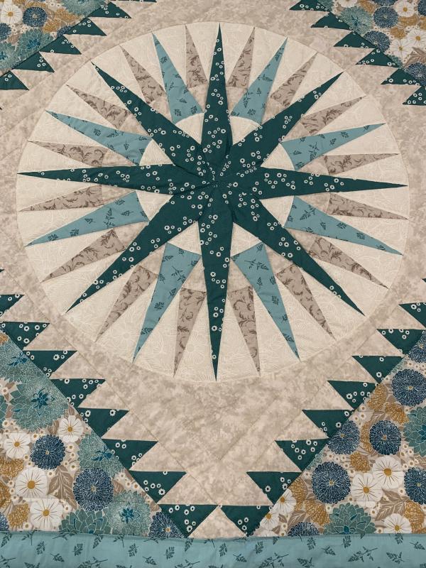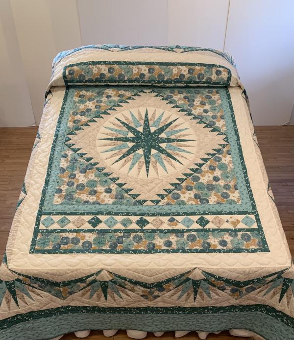 A stunning Mariner's Compass Star creates a center medallion of this handsome quilt. Various borders, including a saw-tooth one flank the central star. The bed skirt portion features Compass points and is a stunning accent to the overall design. The workmanship required to make this quilt is not for a beginner! Hand-quilted by a friend.