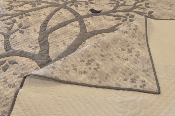 Ah, the sheer simplicity of a pair of trees embellished with a few leaves and home to a family of cardinals! This unusual hand-appliqued design is a fresh take on understated modern quilting.