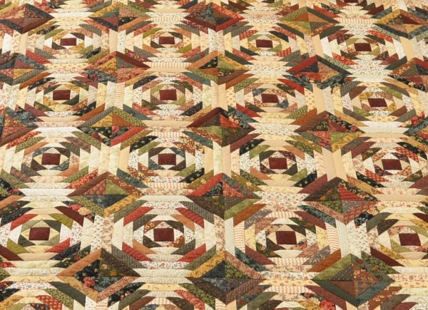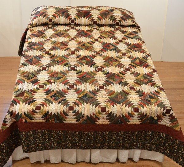 The Pineapple is a beloved variation of the traditional Log Cabin pattern. The center square (hearth of the home) stays the same in each block, but the remainder of the logs are varied, scrappy strips of fabric.