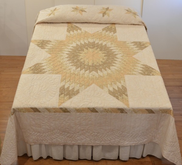 The Lone Star is a classic pattern that appeals to many buyers! It requires careful piecing for the diamonds to align perfectly and the center of the quilt to lay flat.