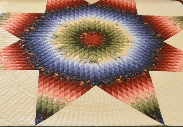 The Lone Star is a classic pattern that appeals to many buyers! It requires careful piecing for the diamonds to align perfectly and the center of the quilt to lay flat.