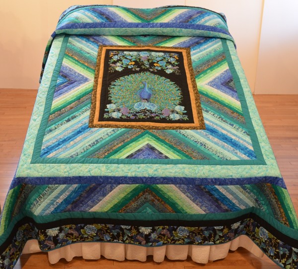 Featuring a beautiful peacock panel with metallic gold accents, this quilt is a one-of-a-kind design from a local Old Order Mennonite quilter. Notice how she chose her accent colors, arranged in diagonal stripes, to compliment the outer border and peacock panel.