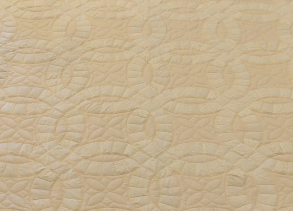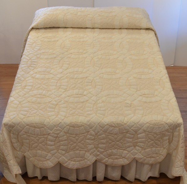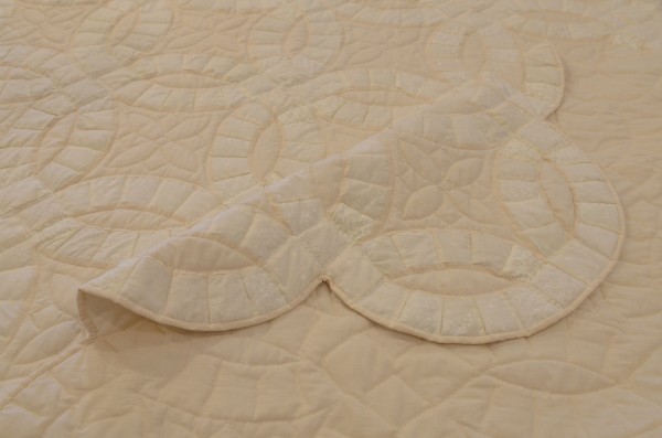 The intertwining circles created from curved pieces of fabric require a skilled seamstress, and the intricate hand-quilting exemplifies outstanding workmanship.