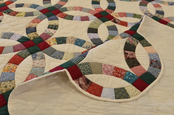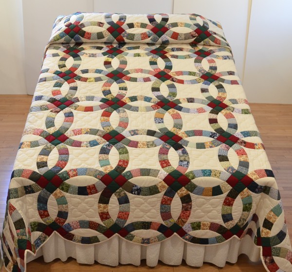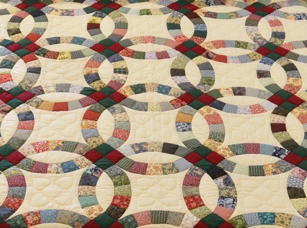 The intertwining circles created from curved pieces of fabric require a skilled seamstress, and the intricate hand-quilting exemplifies outstanding workmanship.