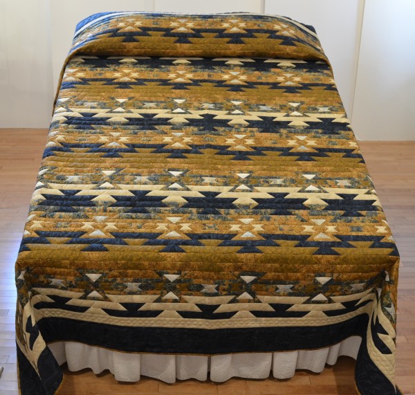 Featuring 12” blocks, each comprised of 76 pieces, the Painted Desert is a piecing work of art. The hand-quilting is dense and adds value to this one-of-a-kind quilt.