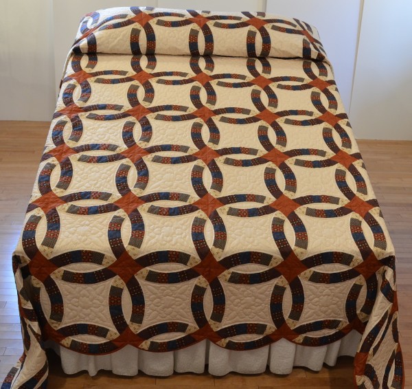 The intertwining circles created from curved pieces of fabric require a skilled seamstress, and the intricate hand-quilting exemplifies outstanding workmanship.