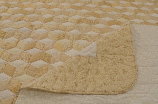 The expert shading in this quilt creates a 3-dimensional effect and the illusion of blocks falling across the bed. The Tumbling Block pattern can only be done well by an experienced seamstress, and the piecing of this traditional design is very precise.