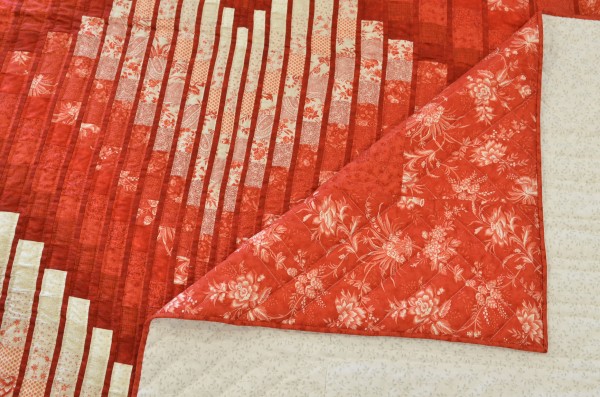 Waves of color seem to skip around the quilt in a random fashion, and thin stripes of color break the shifting waves.