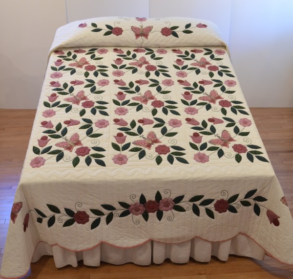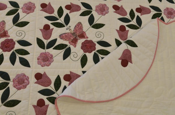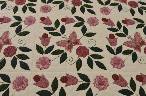 There are many, many hours of handwork on this applique quilt. Each of the butterflies, leaves, and flowers was sewn on by hand. The quilting was also done by hand.