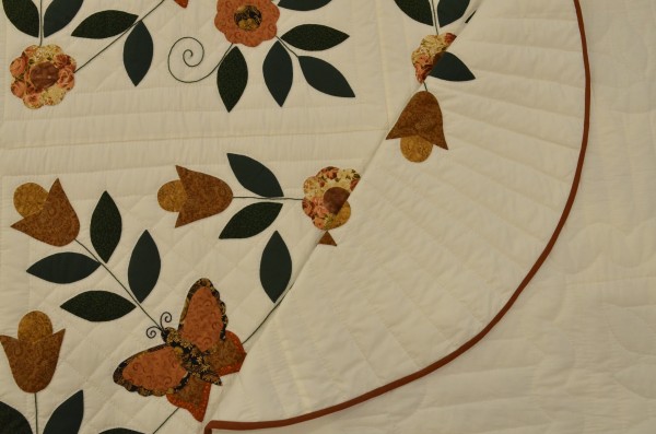 There are many, many hours of handwork on this applique quilt. Each of the butterflies, leaves, and flowers was sewn on by hand. The quilting was also done by hand.