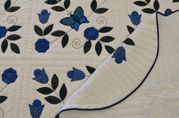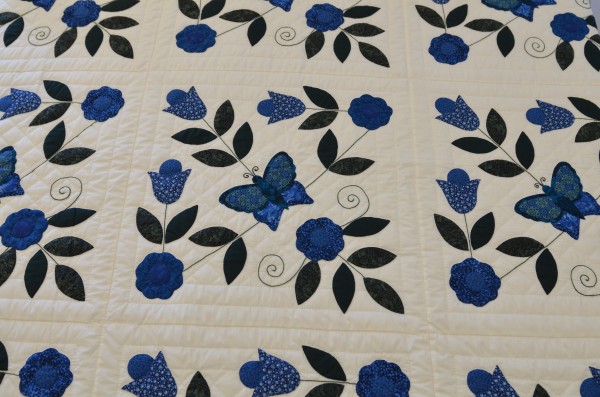 There are many, many hours of handwork on this applique quilt. Each of the butterflies, leaves, and flowers was sewn on by hand. The quilting was also done by hand.