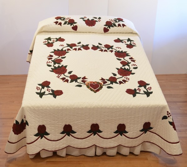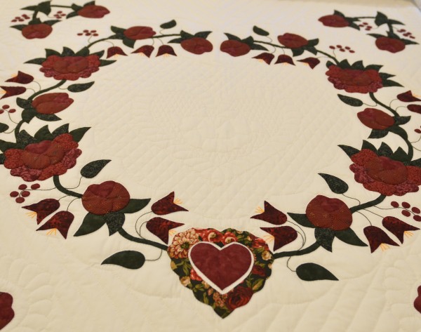 A beautiful romantic quilt design, the Heart of Roses quilt features hand-appliqued roses, leaves and berries in a pleasing heart-shaped arrangement.