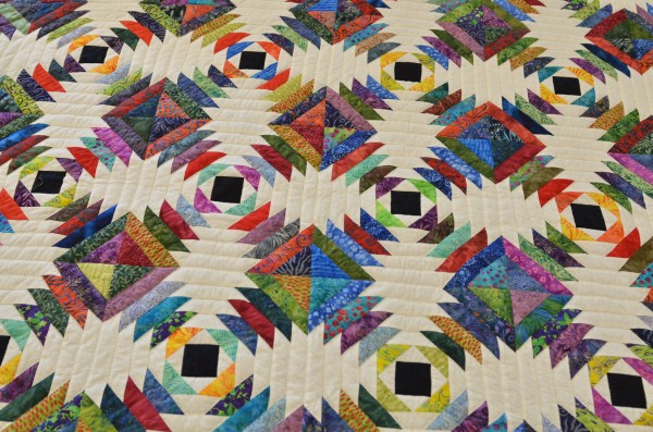 The all-over design holds a lot of energy and is happily framed with both sashing and border. This pattern is always a favorite among quilt buyers for is old-fashioned appeal and modern aesthetic.