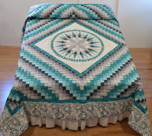 There are three popular quilt patterns in this lesser-known gem. In the center find the Mariner’s Compass star which is encased in a ring of Flying Geese triangles. The quilt’s center block is surrounded by a Trip Around the World block arrangement.