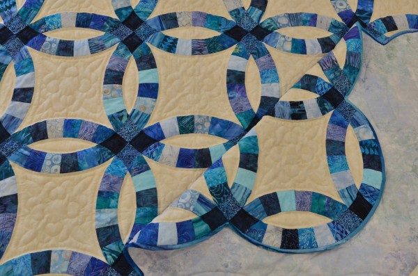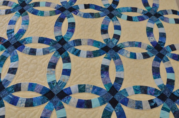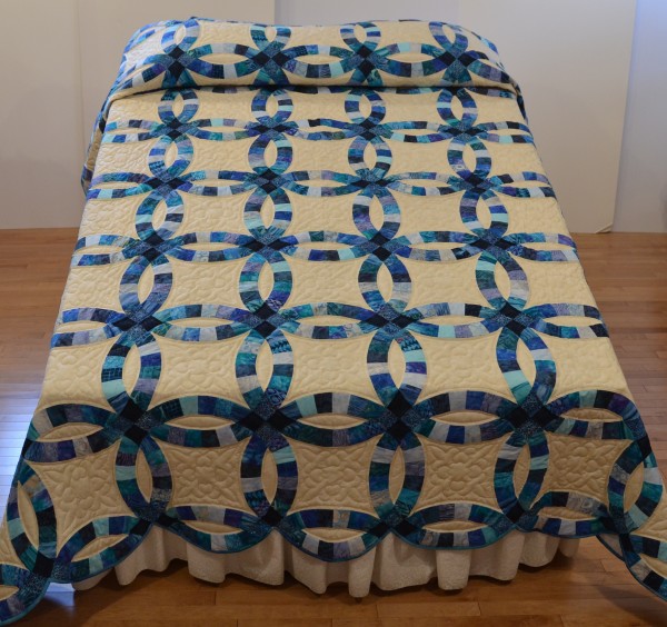 The intertwining circles created from curved pieces of fabric require a skilled seamstress, and the intricate hand-quilting exemplifies outstanding workmanship.