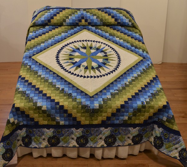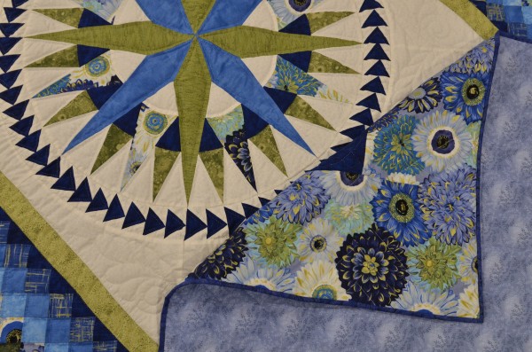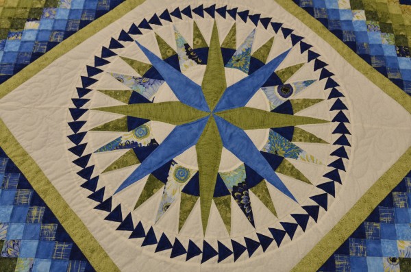 There are three popular quilt patterns in this lesser-known gem. In the center find the Mariner’s Compass star which is encased in a ring of Flying Geese triangles. The quilt’s center block is surrounded by a Trip Around the World block arrangement.