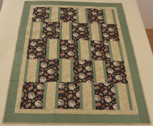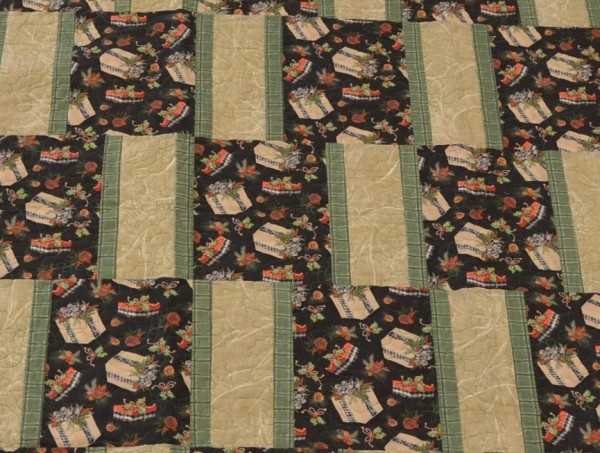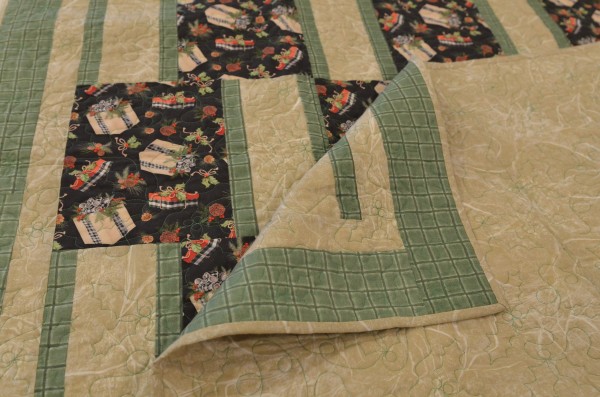 A beautifully made throw-sized quilt! The Christmas-themed fabrics would make this a great gift! Please note, this quilt is machine-quilted. Hand-made by a friend, Lancaster County, PA.
