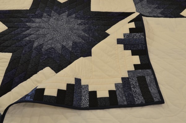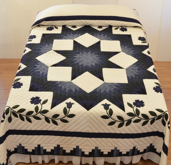 The star seems to have a 3-dimensional quality to it just because of the placement of the colors. Set against the ivory background, the star sings! We love this variation of the Lone Star pattern. Additionally, this quilt features appliqued flowers surrounding the star. Stunning!