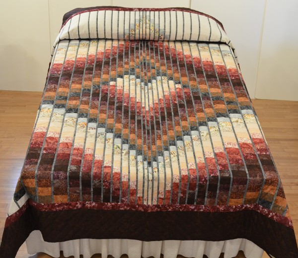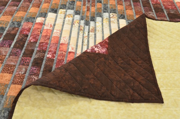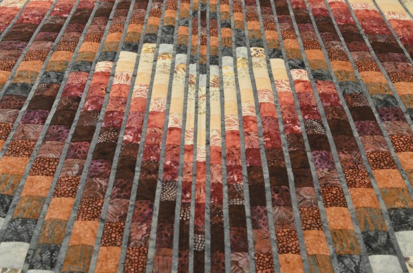 Waves of color seem to skip around the quilt in a random fashion, and thin stripes of color break the shifting waves.
