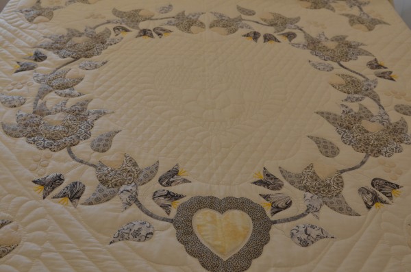 A beautiful romantic quilt design, the Heart of Roses quilt features hand-appliqued roses, leaves and berries in a pleasing heart-shaped arrangement.