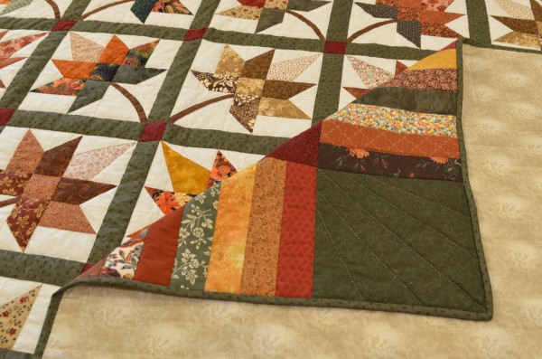 Each leaf is composed of eight pieced sections and multiple fabrics, making this a well-designed scrap quilt.