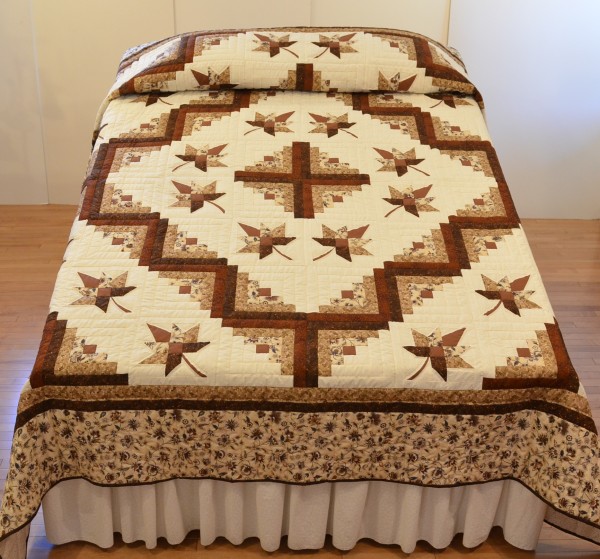 Gently falling maple leaves have drifted onto the familiar Log Cabin design, creating a pleasing, new variation to the traditional Log Cabin quilt. Notice how each Maple Leaf block is carefully placed with points strategically encircling the diagonal stripes of the overall design. Lovely!
