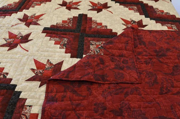 Gently falling maple leaves have drifted onto the familiar Log Cabin design, creating a pleasing, new variation to the traditional Log Cabin quilt. Notice how each Maple Leaf block is carefully placed with points strategically encircling the diagonal stripes of the overall design. Lovely!