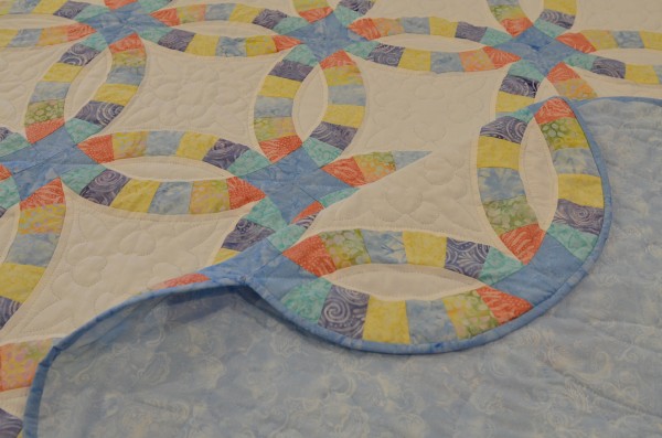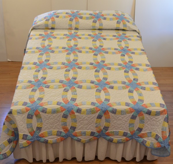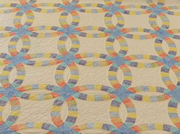 The intertwining circles created from curved pieces of fabric require a skilled seamstress, and the intricate hand-quilting exemplifies outstanding workmanship.