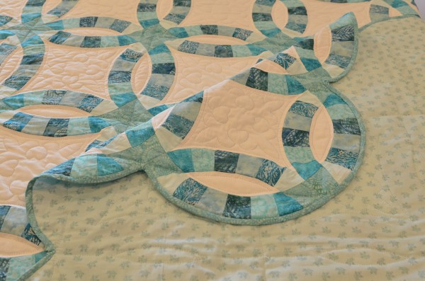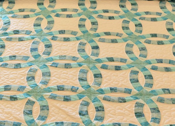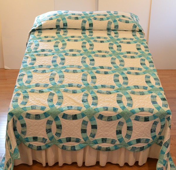 The intertwining circles created from curved pieces of fabric require a skilled seamstress, and the intricate hand-quilting exemplifies outstanding workmanship.