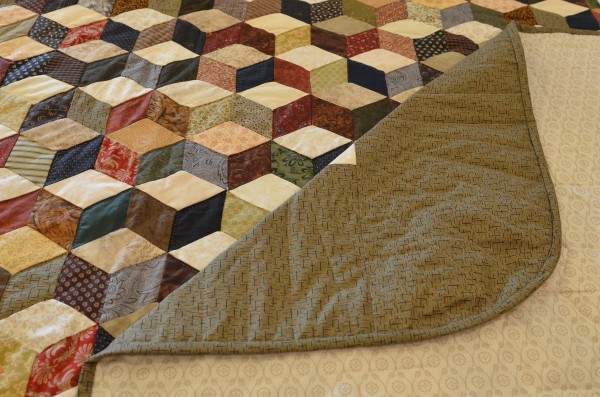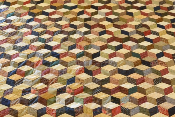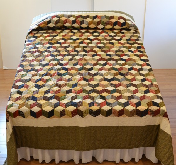 The expert shading in this quilt creates a 3-dimensional effect and the illusion of blocks falling across the bed. The Tumbling Block pattern can only be done well by an experienced seamstress, and the piecing of this traditional design is very precise.