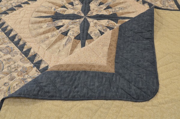 A stunning Mariner's Compass Star creates a center medallion of this handsome quilt. Various borders, including a saw-tooth one flank the central star.