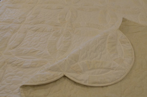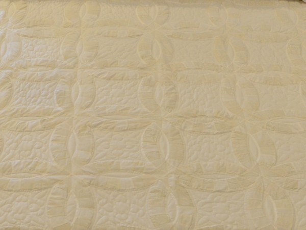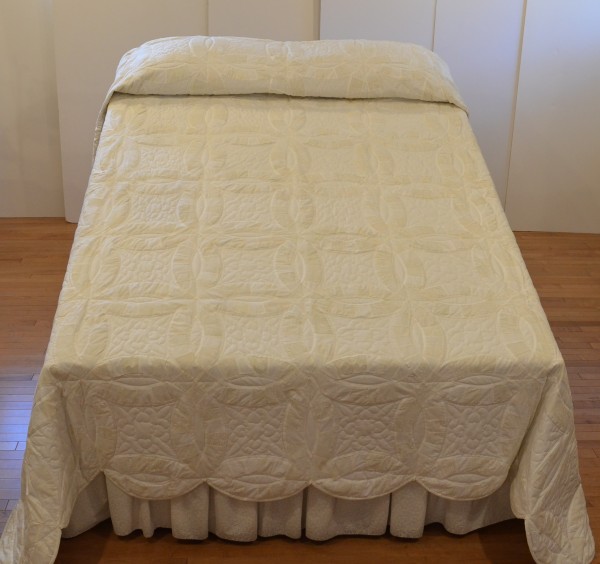 The intertwining circles created from curved pieces of fabric require a skilled seamstress, and the intricate hand-quilting exemplifies outstanding workmanship.