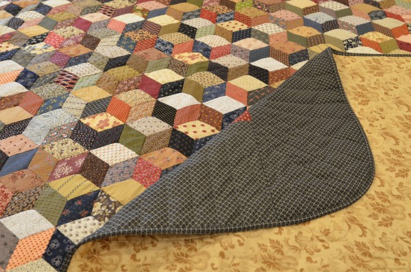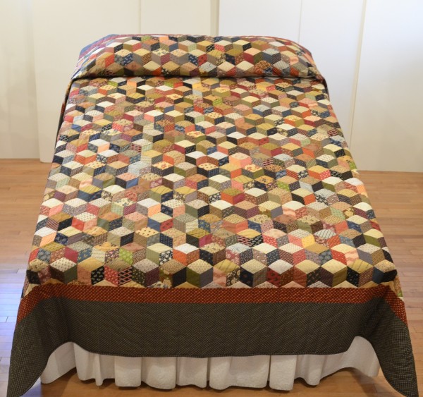 The expert shading in this quilt creates a 3-dimensional effect and the illusion of blocks falling across the bed. The Tumbling Block pattern can only be done well by an experienced seamstress, and the piecing of this traditional design is very precise.